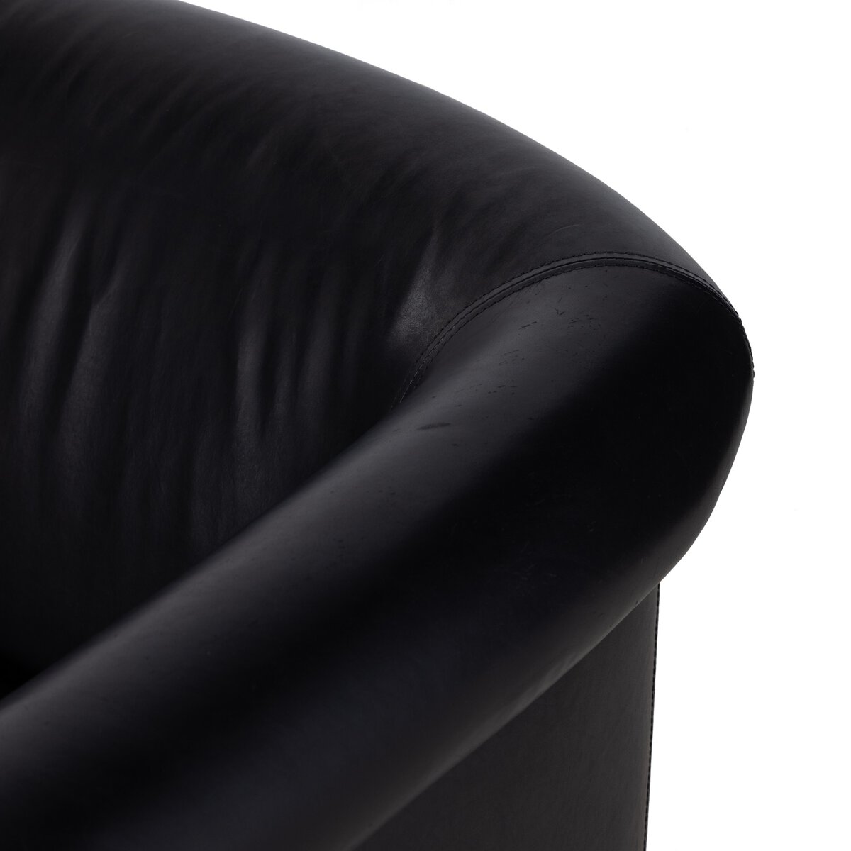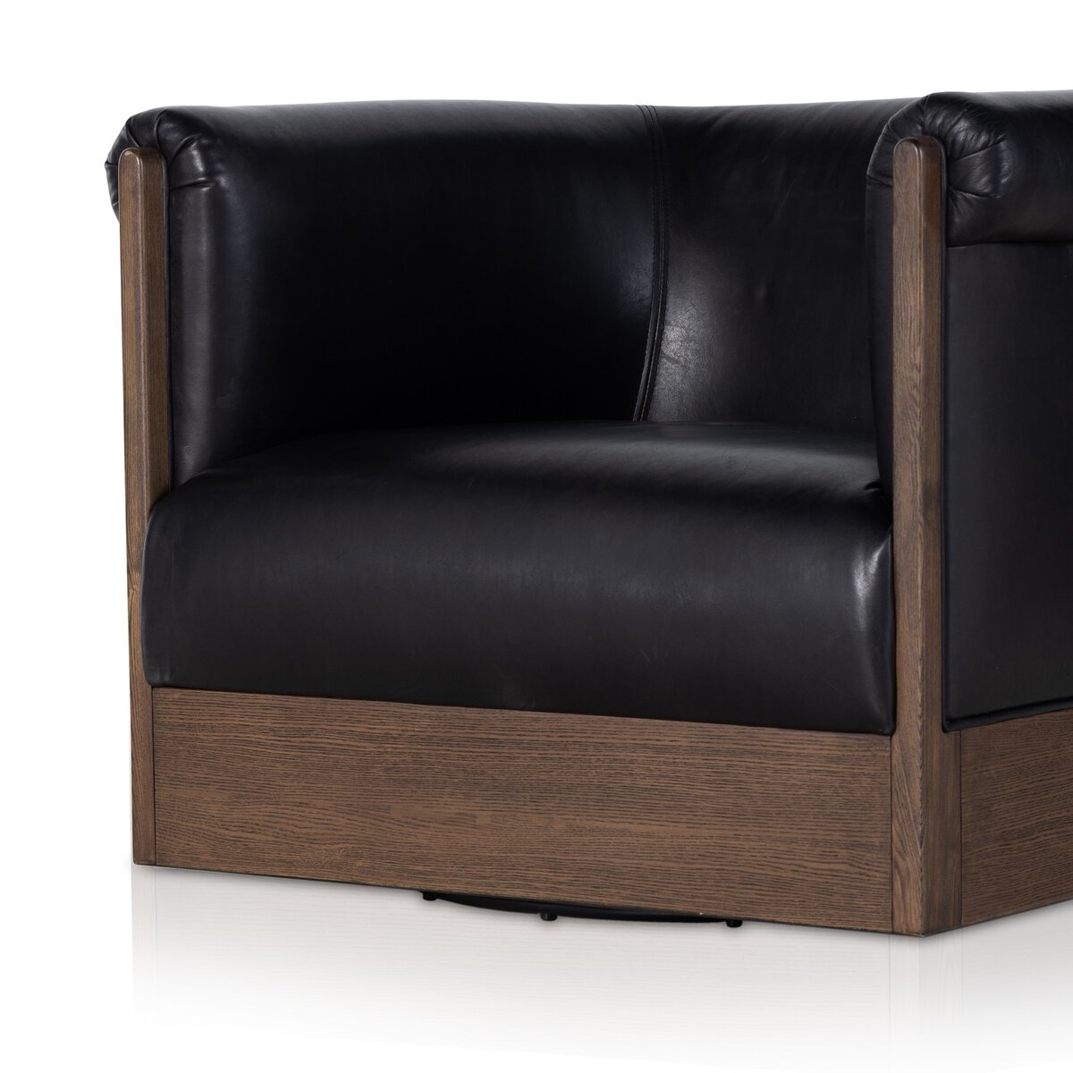 The traditional barrel-backed chair gets updated by way of rolled arms and wood working. Upholstered in a rich heirloom leather and mounted on a 360-degree swivel for a fresh twist on the classic leather club chair.