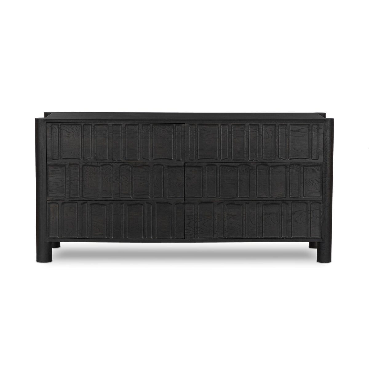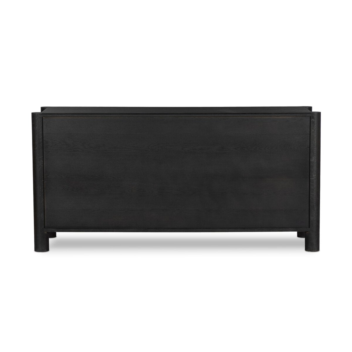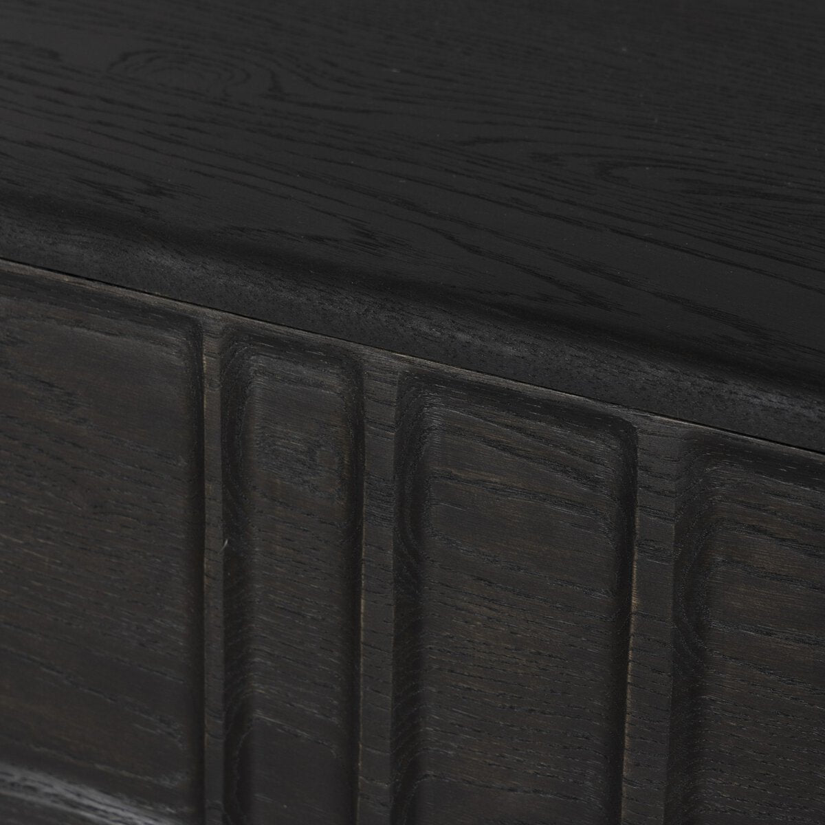 Grain and character variation within a solid oak finish give this sideboard organic visual interest. The organic carved design and floor-to-top cylinder legs give a primitive look that balances the movement of the wood pattern.