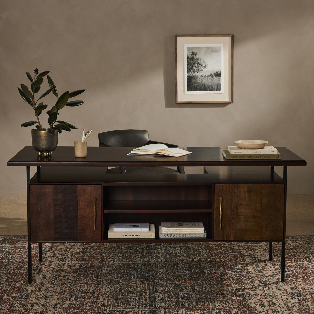 This mid-century inspired lawyer's desk offers heavy-duty storage with two-sided cabinetry. A floating top and simple iron legs keeps the look light and modern.