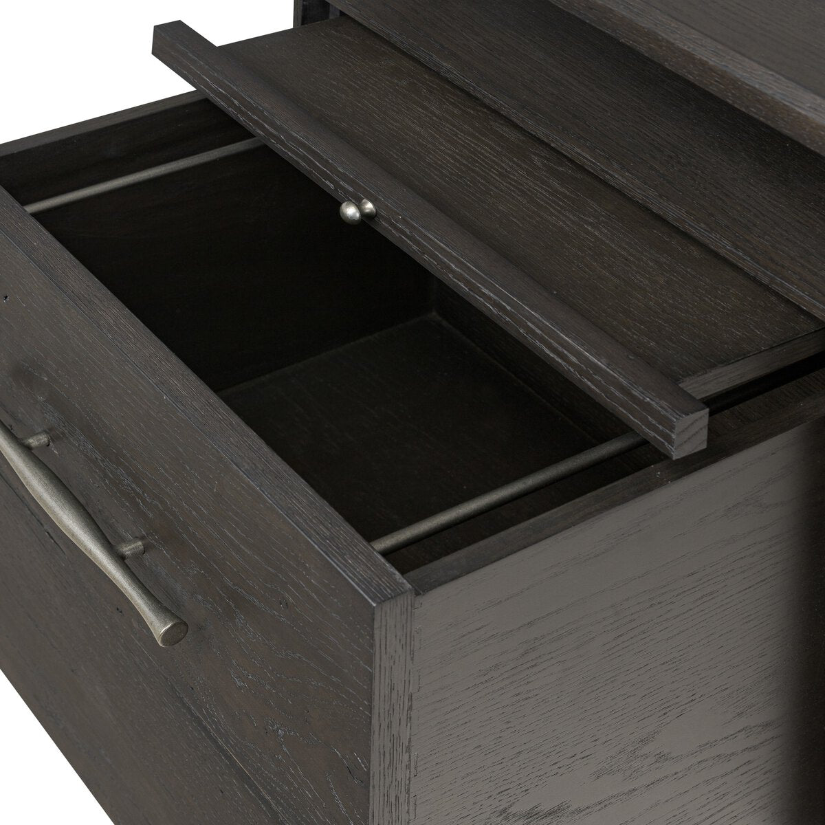 - Resawn Charcoal Oak, Dark Steel Legs, Pewter Hardware