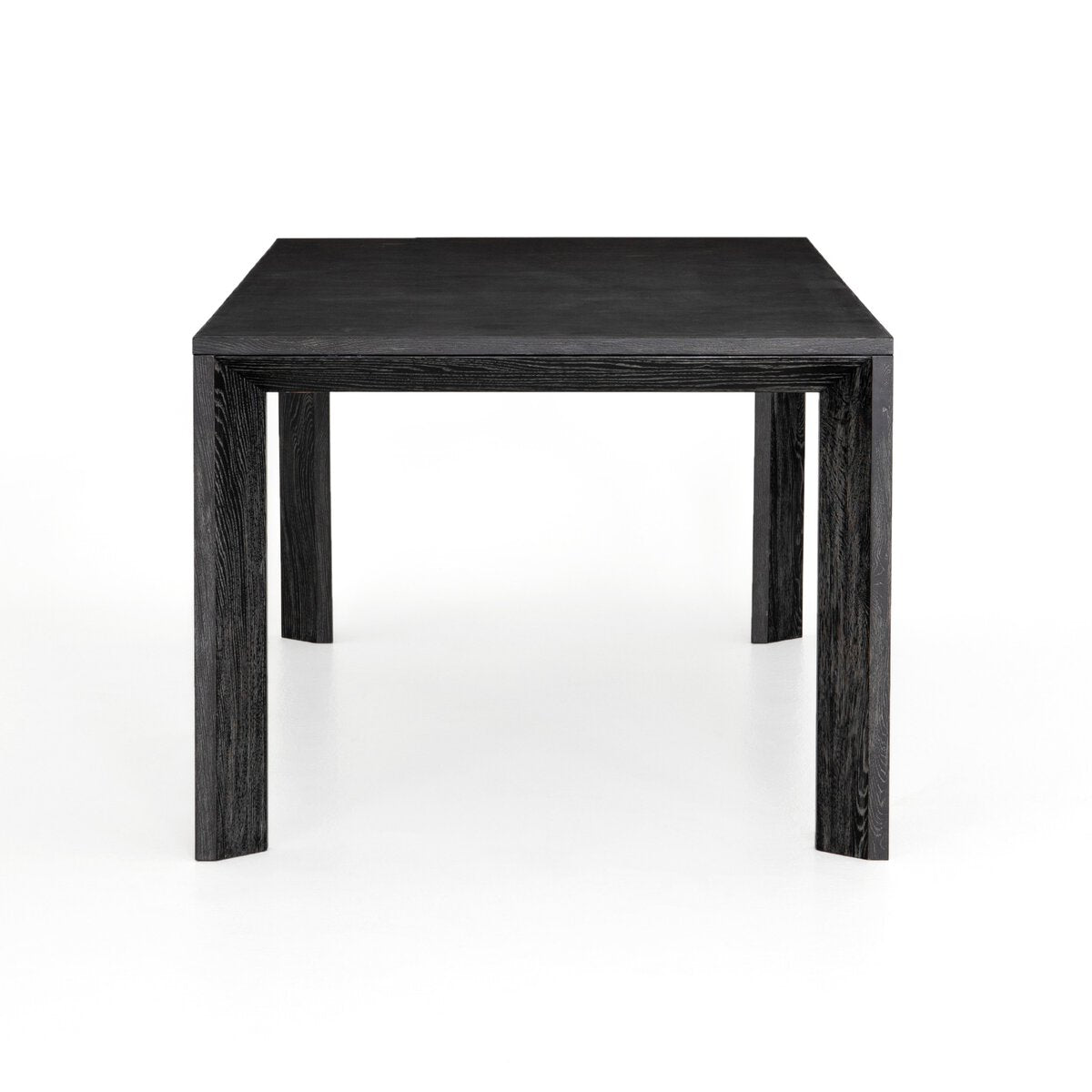Simple while sophisticated. A clean, Parsons-style dining table of black-washed oak adopts new depth by way of a bluestone inset top and cleverly splayed legs. White mineral lines and subtle color, texture and pattern variations are to be expected and speak to each stone's individual nature.