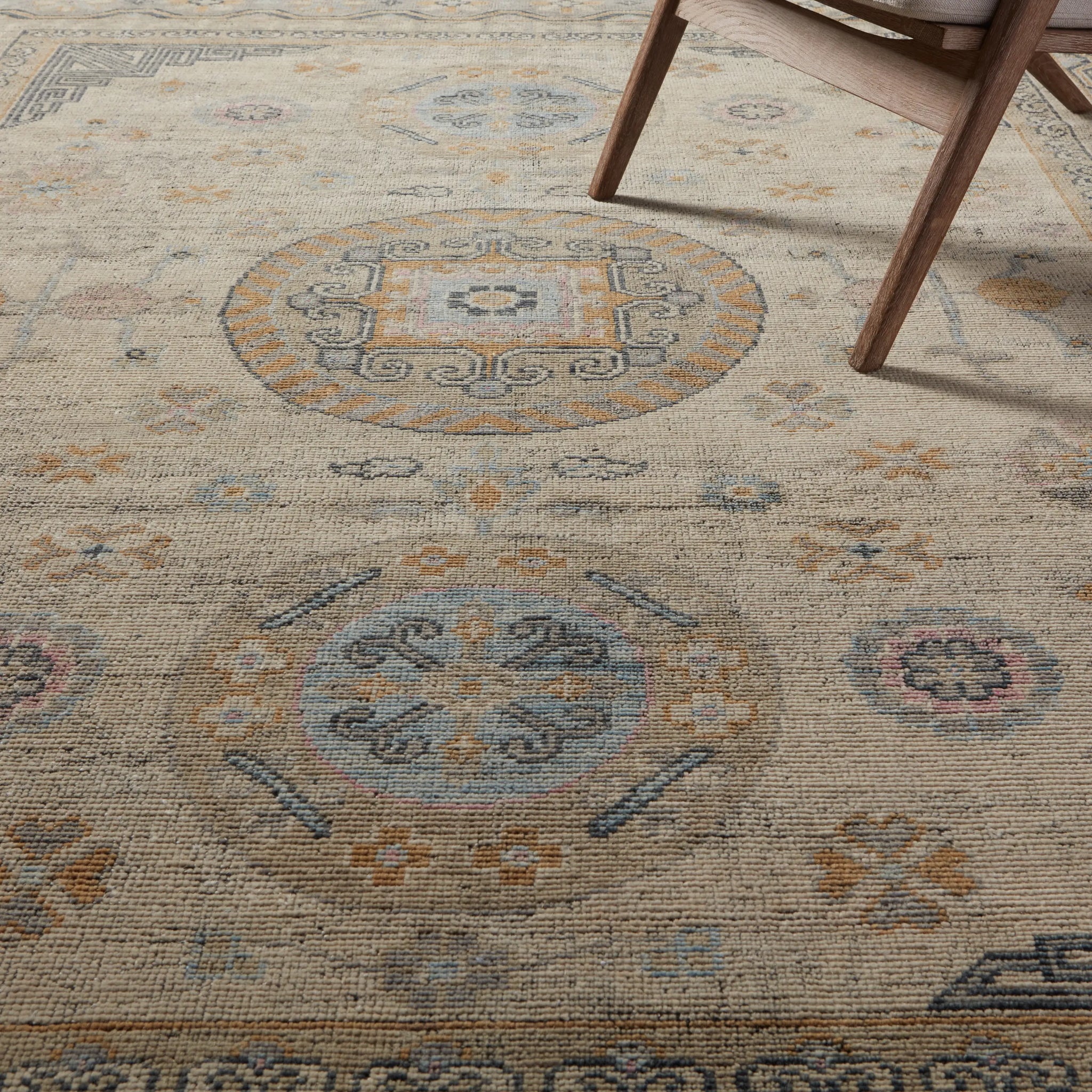 The Edwin area rug boasts a beautifully washed medallion motif with a tile-like, decorative border detail. The light ivory tone is accented with rich green-blue, ochre, and sky blue hues for added depth and intrigue. This durable wool handknot anchors living spaces with a fresh take on vintage style.