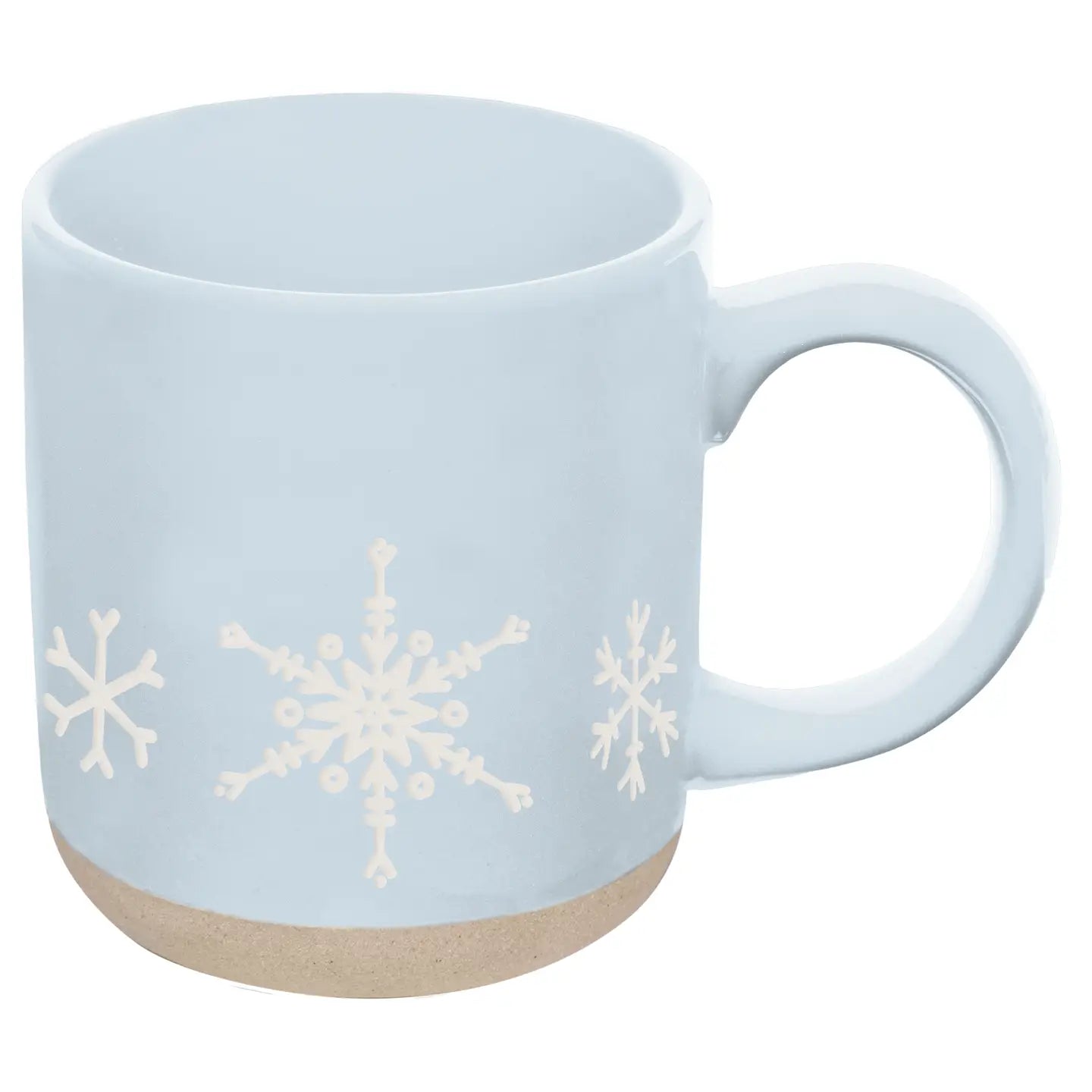 Add a festive touch to your holiday mugs assortment with our light blue Snowflakes Stoneware Mug. Featuring a delicate white snowflake pattern along the bottom, this seasonal coffee mug is perfect for hot cocoa, cider, or holiday tea.