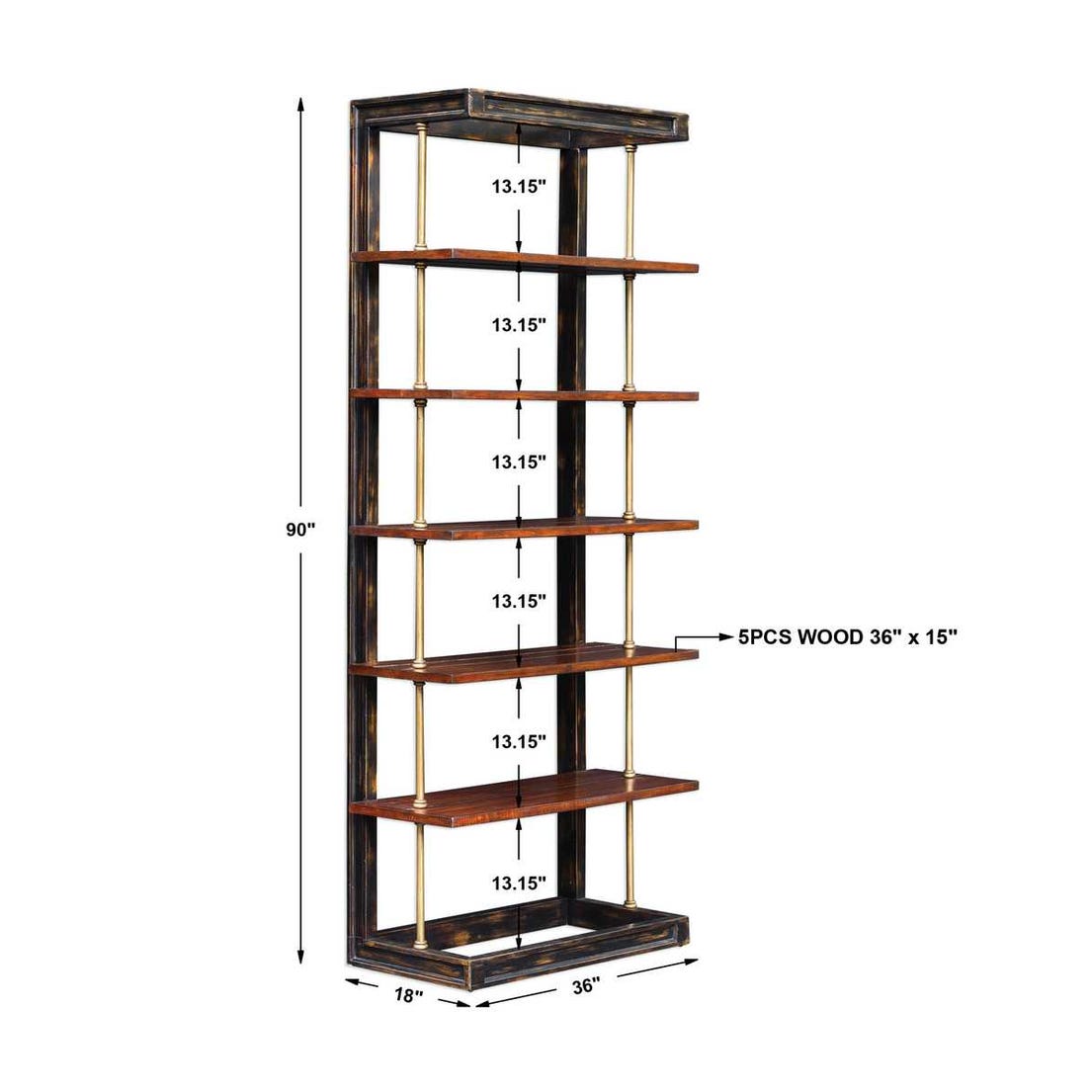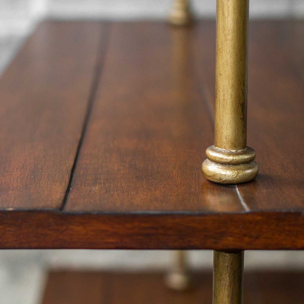 Antique brass finished iron support rods suspend dark honey stained display shelves, encased in an open style mango wood frame, and hand rubbed in worn black with honey undertones.