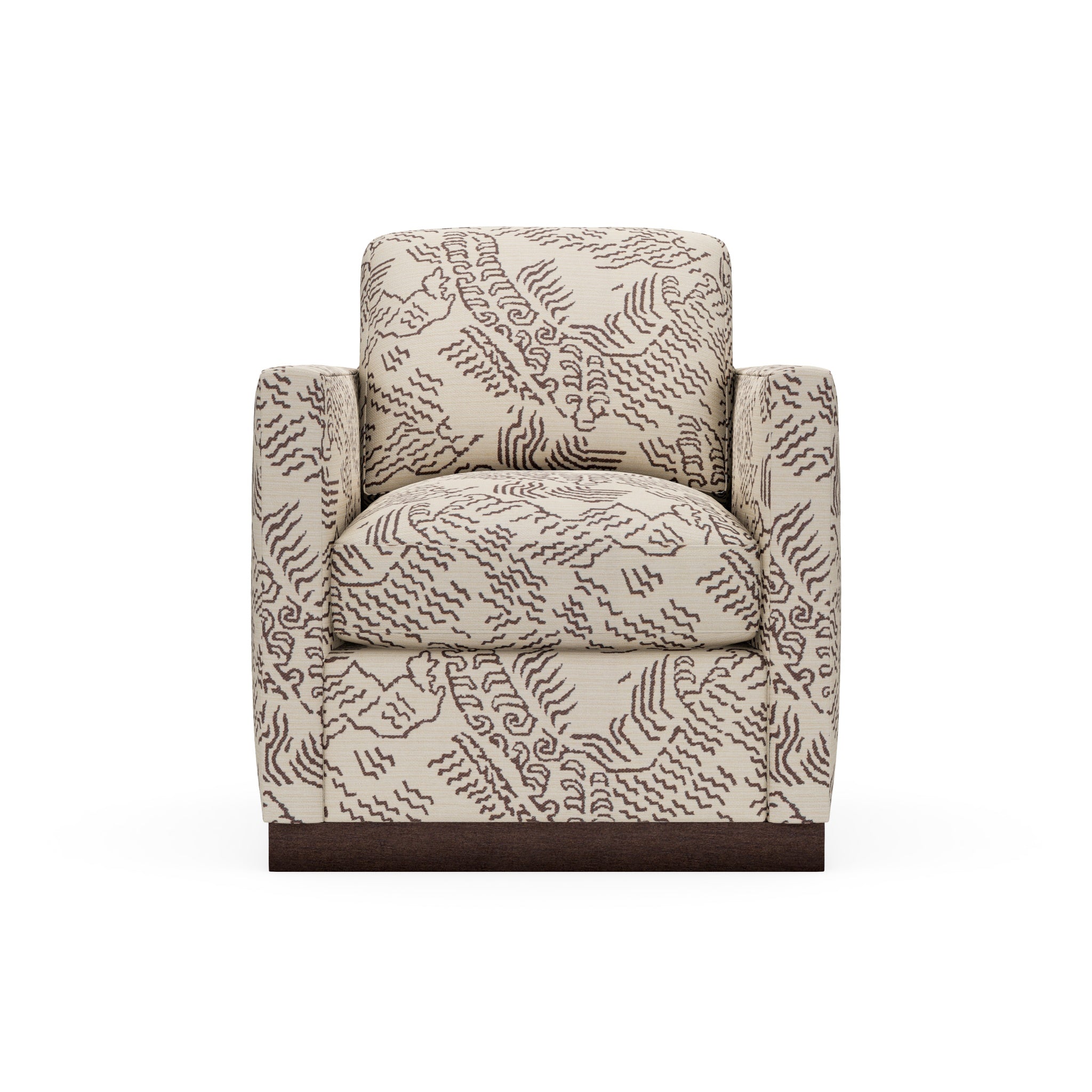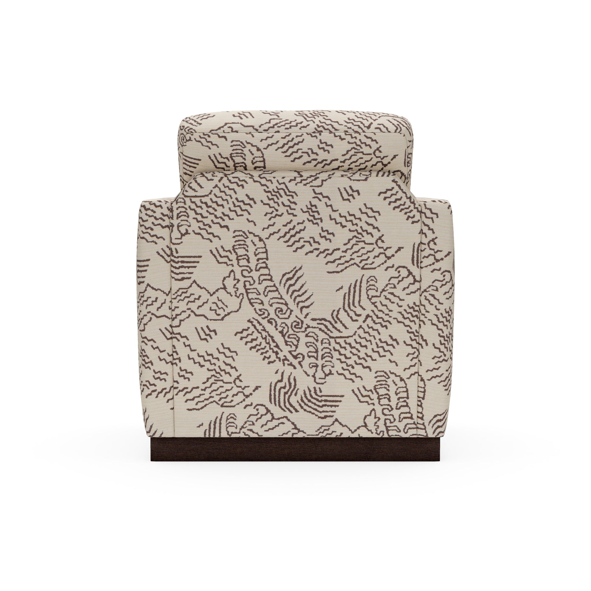 The Floor Model Allie Swivel Chair is in Fabric 40677-94 (Cocoa, Grade MM, Swatch Number 1467) with a Chocolate Finish and a Bliss Cushion.