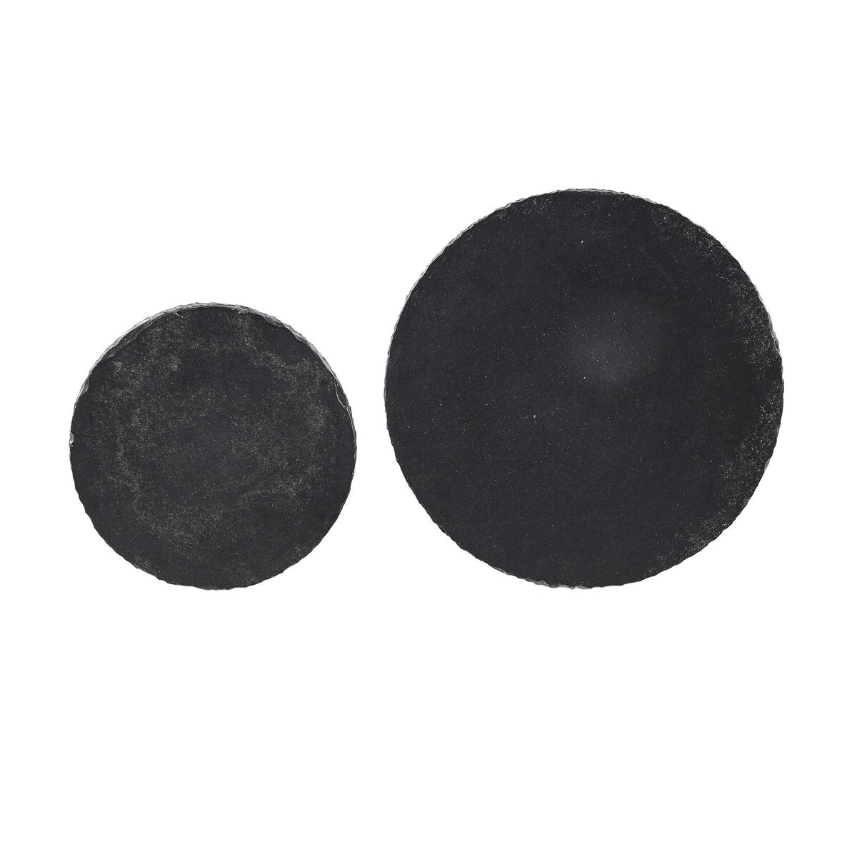 Natural elements and architectural inspiration, captured in a pair of nesting end tables. Rounded basalt tabletops rest on intersecting oak planes in this statement-making pair that lends form and function to the living space.