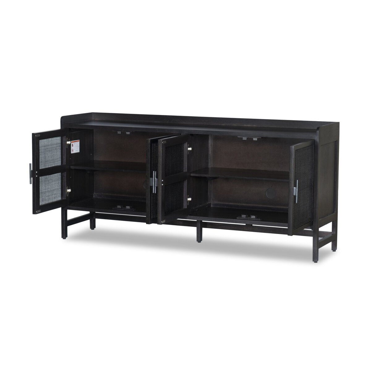 Monochromatic with a textural twist. Mango wood frames woven cane fronts, with black iron hardware for subtle contrast. Inside, spacious shelving awaits storage of dinnerware and more.
