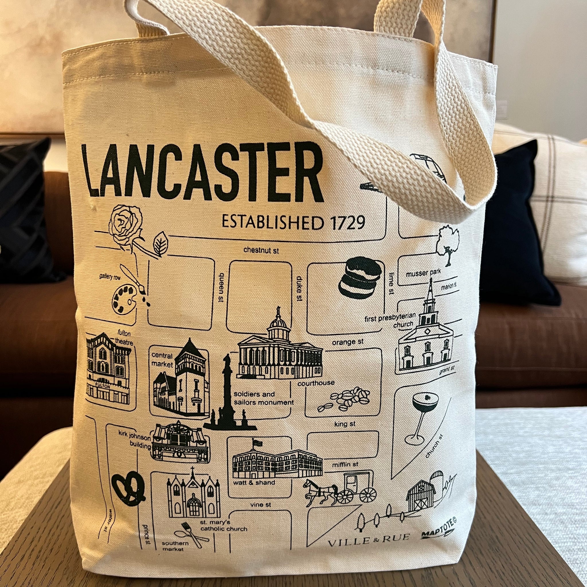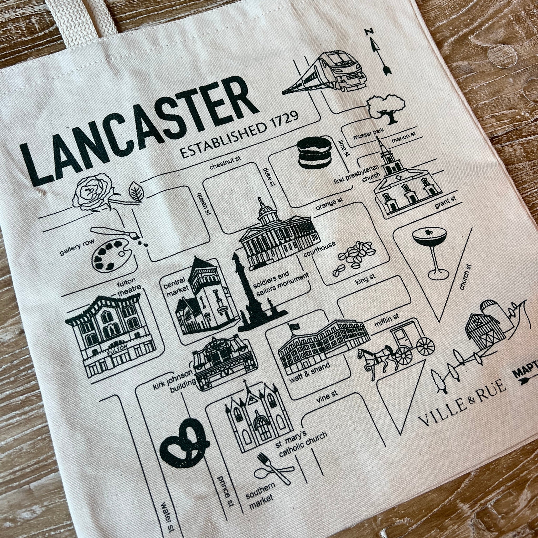 Elevate your everyday errands with our Market Totes collection!  Featuring our iconic city, Lancaster, these totes add a touch of local flair to your shopping routine. Each bag is crafted from 100% natural cotton canvas and includes a handy inside pocket, making them as functional as they are stylish. Proudly cut, sewn, and printed in Brooklyn, NY, our totes are perfect for your daily adventures.