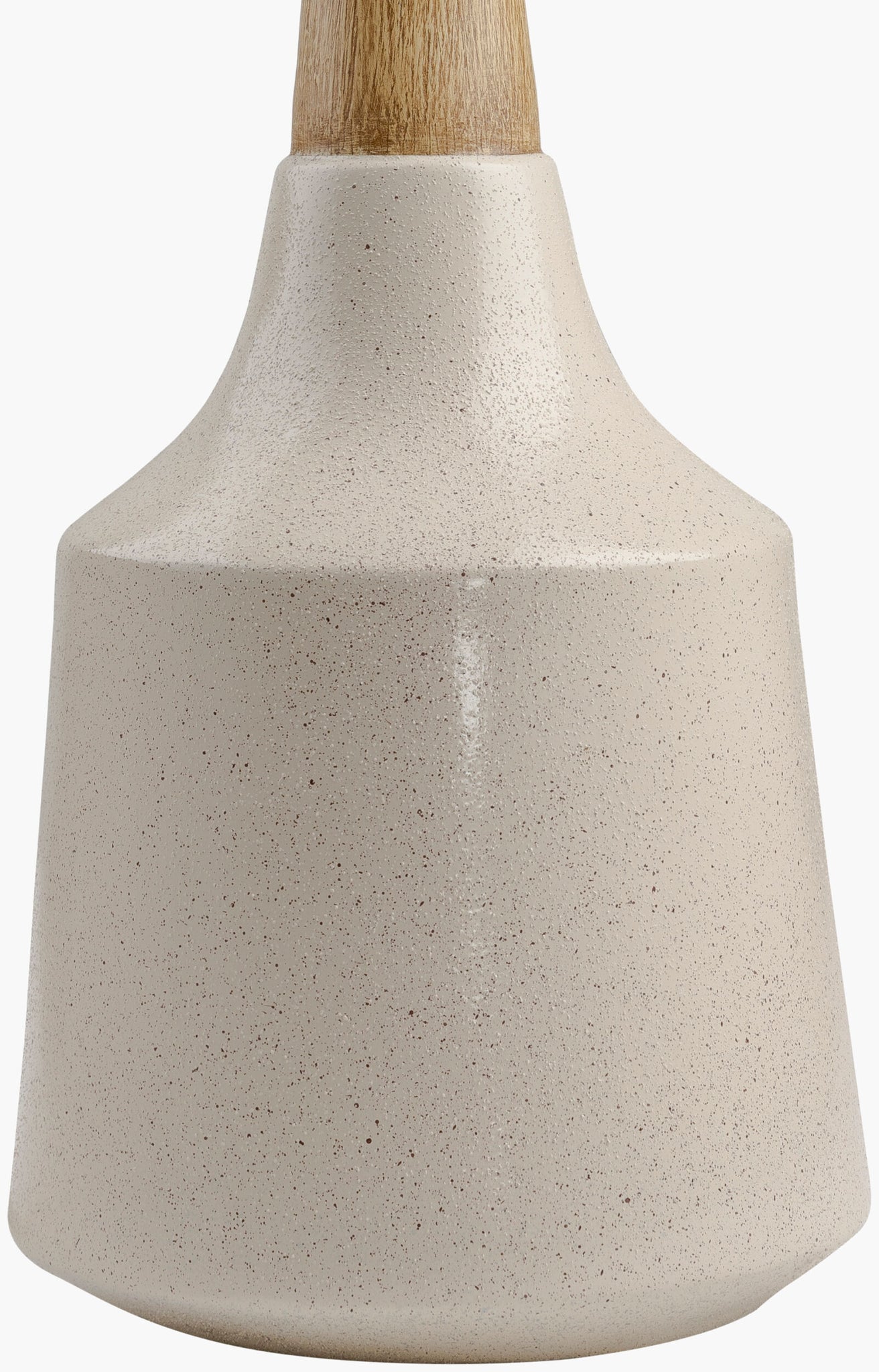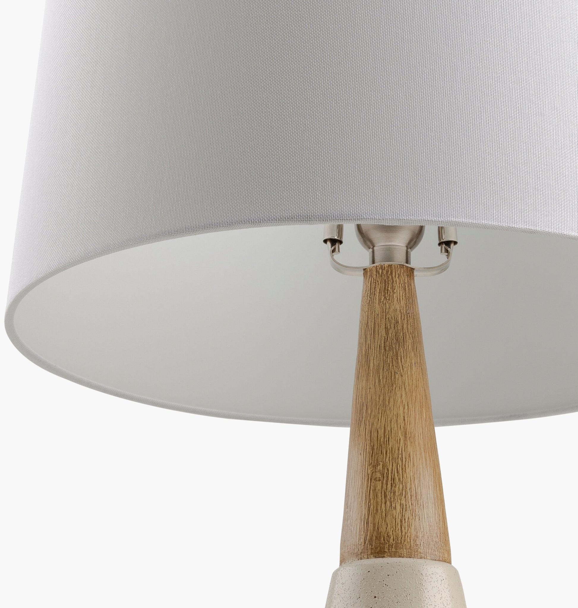 The Kemper table lamp embodies soft, minimalistic style. With a glaze body and wood detailing, this two-toned light fixture offers a versatile accent.