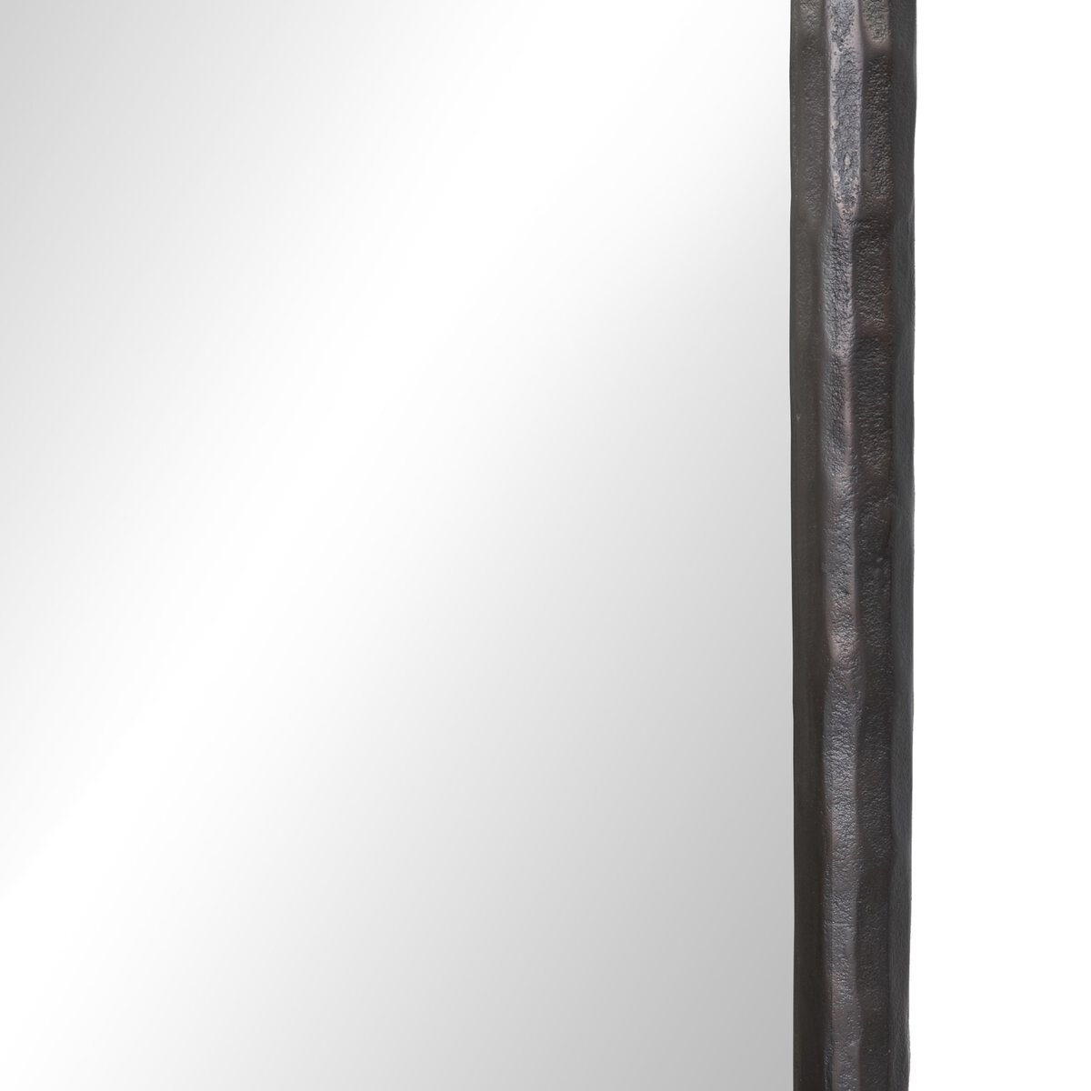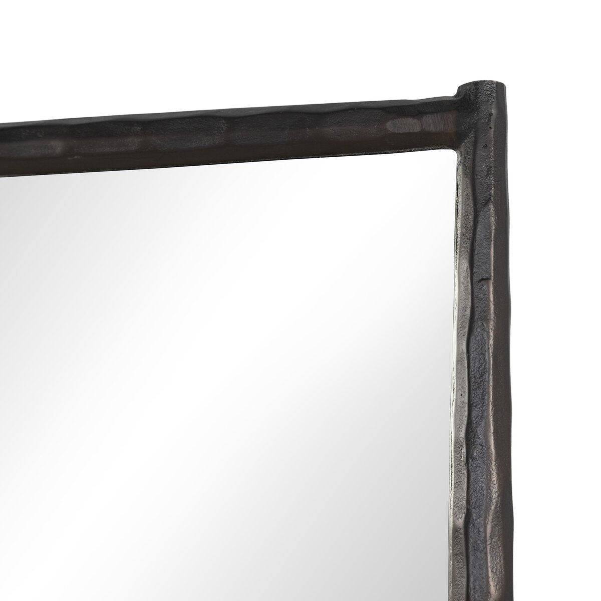 Hammered, cast aluminum shapes the streamlined frame of this floor mirror. Double-sided tapered legs elevate the mirror, for a balance of airiness with the heavy material.
